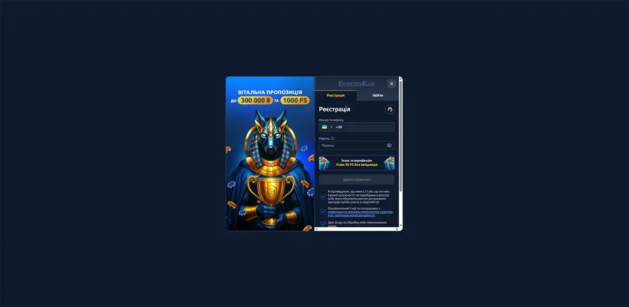 Реєстрація в Чемпіон клабі доступна через офіційний сайт та виконується із застосуванням номера телефону. Процедура передбачає обов’язкове підтвердження даних користувача. Усі дії фіксуються в системі. Реєстрація в Чемпіон клубі є єдиним способом створення ігрового профілю.